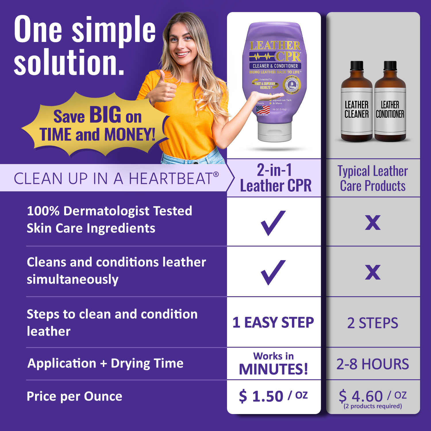 - No Sticky Or Greasy Residue: No need to buy a separate cleaner & conditioner. Leather CPR cleans & conditions in one easy step saving time & money. CPR dries in minutes not hours, and will not leave your leather couch, car seats, purses, or jackets feeling sticky.