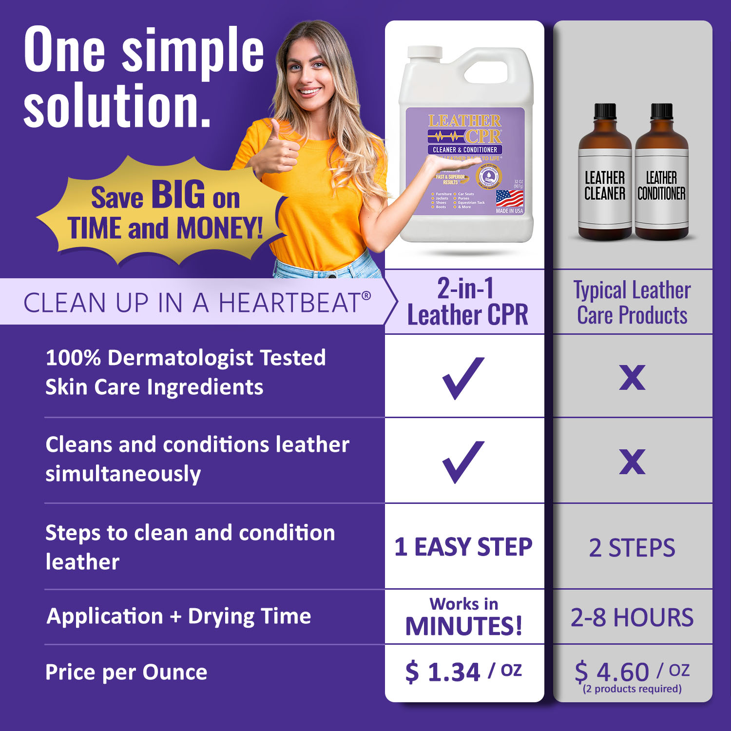 - Protect Your Family: Your family’s skin comes in contact daily with leather items. Leather CPR is the only leather care product made with 100% cosmetic skincare ingredients and dermatologist tested to ensure it will not irritate your family’s skin.